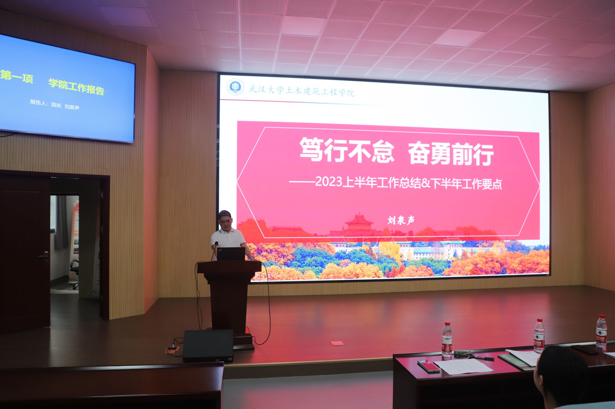 院长刘泉声作学院工作报告,总结上半年工作,展望下半年工作。刘院长围绕师资队伍建设、人才培养体系、学科建设、管理服务、党建与思想政治工作五个方面总结了学院2023年上半年的工作,向全体教职工汇报了学院工作取得的成绩与突破,从“推进人事人才工作”、“深化教学改革”、“提升学科科研动力”、“提高管理服务”、“加强党的建设”等五个方面介绍了学校工作思路和学院下半年工作重点,为接下来的工作确定了方向和目标。他希望全体教职工笃行不怠,奋勇前行,争取全年工作取得好成绩。