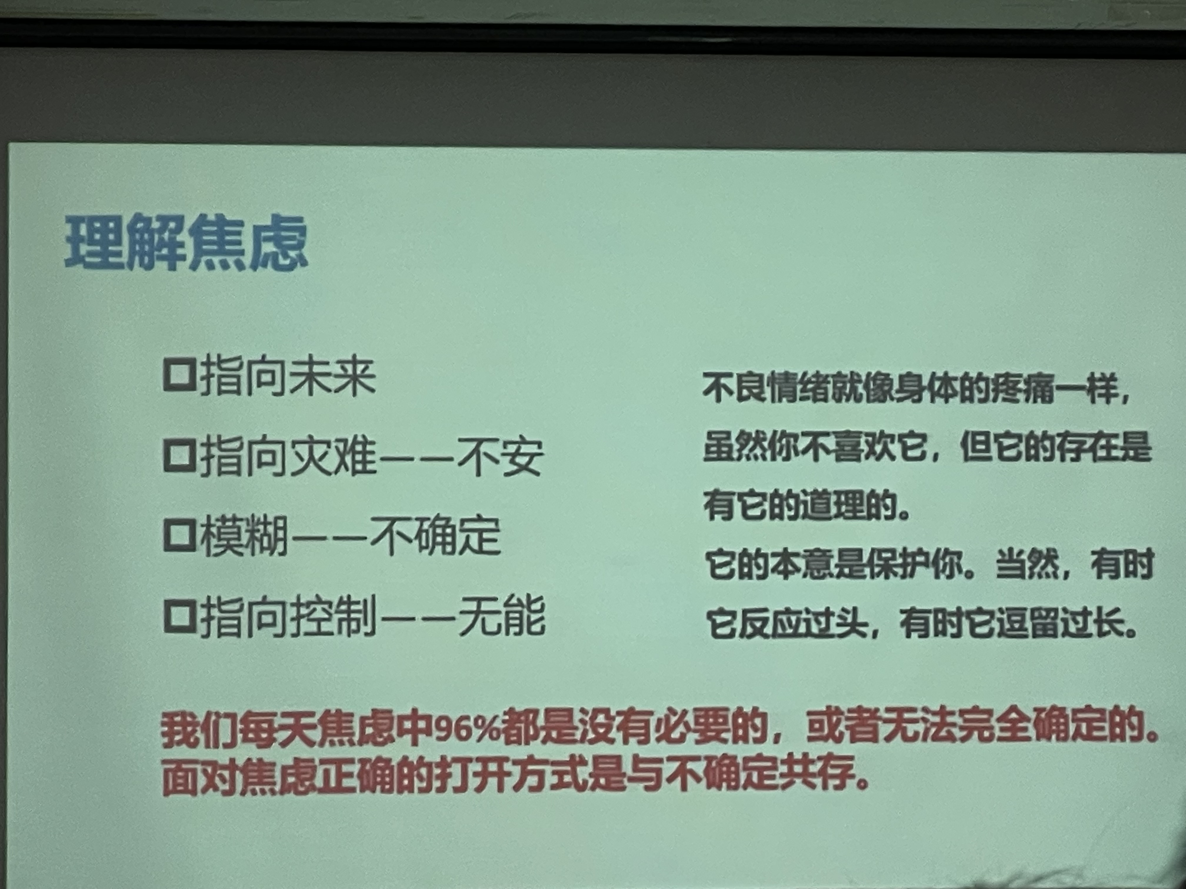 马鑫老师深入浅出地为大家讲解了人为什么会焦虑、焦虑的表现、焦虑的必要性、如何正确理解焦虑等问题。